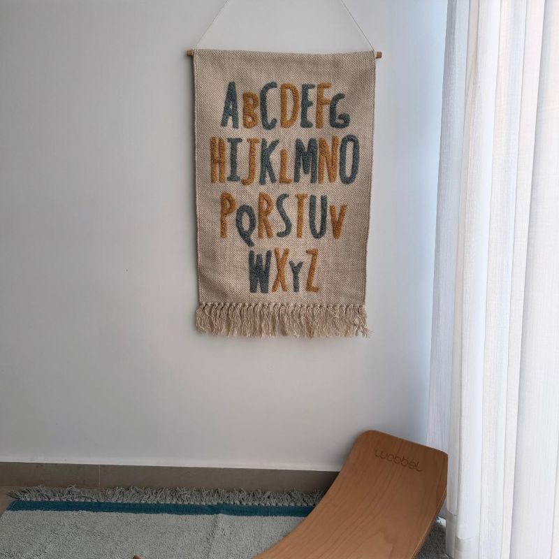 תמונת קיר, אריג לתלייה על הקיר לחדר הילדים, של אותיות ה-ABC בגווני כחול וחרדל. אריג מהמם ומעוצב במיוחד בשבילנו ל-K-kids קייקידס.